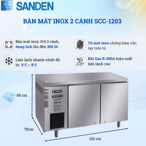 BÀN MÁT INOX SANDEN SCC-1203 – DUNG TÍCH 300L, BẢO QUẢN MÁT ỔN ĐỊNH, TỐI ƯU KHÔNG GIAN BẾP